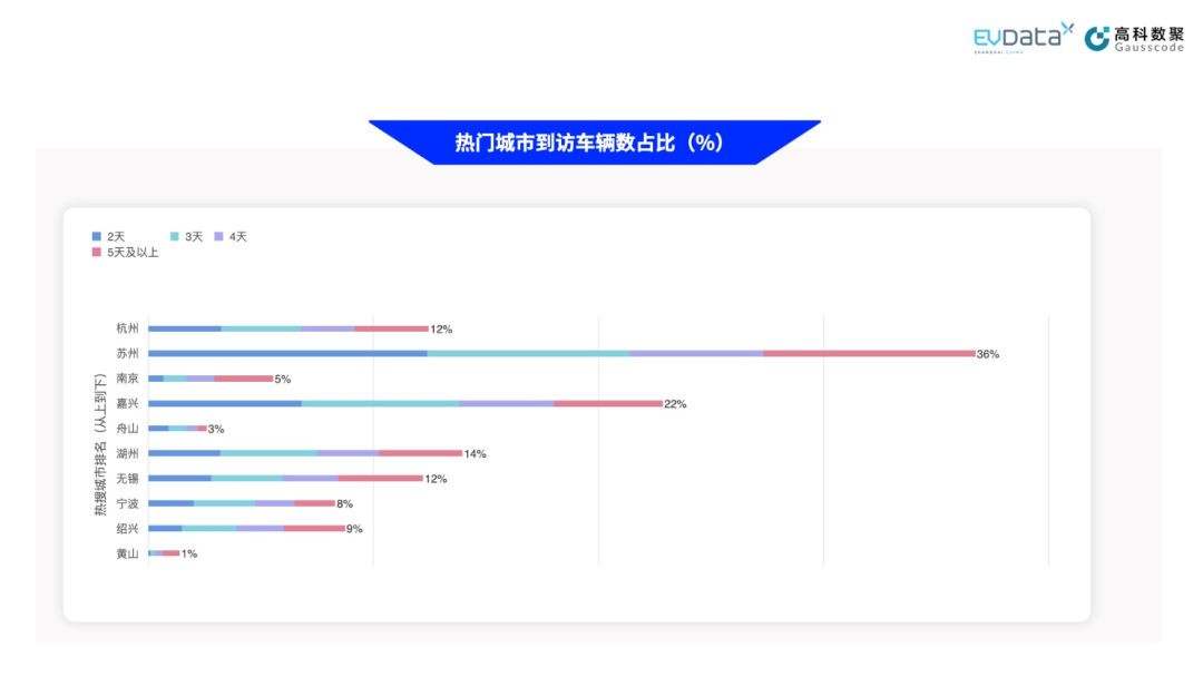 为深入分析离沪新能源车辆的短期出行体验,以下按照单次离沪天数将新能源车辆划分为不同的组别并进行分析[9]。下图纵轴为上海新能源汽车关注人群的热门旅游城市排名(从上到下),横轴为上海新能源汽车的到访数量,并对到访数量的构成以不同颜色区分。以苏州为例,离沪样本中36%的车辆抵达过苏州市,其中蓝色代表2天组在总到访车辆中的占比。